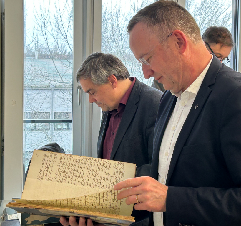 Am 4. Februar wurde das Digitalisierungsprojekt im Landeskirchlichen Archiv vorgestellt. Dr. Alexandra Lutz, Leiterin des Landeskirchlichen Archivs, freute sich besonders über das Projekt, da die Pfarrbeschreibungen nun von der Forschung viel stärker wahrgenommen werden. Sie betonte, dass der unkomplizierte Zugang zu Archivgut wichtig und zeitgemäß sei und dass das Archiv derzeit viele Projekte zur Digitalisierung durchführe. Landesbischof Christian Kopp verwies auf die Bedeutung der Erinnerungskultur. Geschichte sei wichtig für die Gestaltung der Gegenwart und der Zukunft. Insbesondere die Pfarrbeschreibungen hätten zudem einen praktischen Nutzen. Auch ihm sei als junger Pfarrer an seiner ersten Pfarrstelle eine Pfarrbeschreibung an die Hand gegeben worden, die ihm wertvolle Einblicke in die Gemeinde gab.